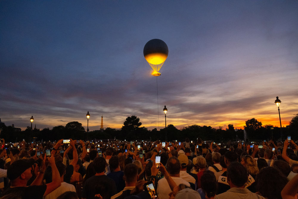歷史建筑與現(xiàn)代藝術(shù)的融合彰顯法式浪漫。埃菲爾鐵塔上的燈光秀劃破夜空。特羅卡德羅廣場(chǎng)上,神秘人將火炬交給法國(guó)傳奇球星齊達(dá)內(nèi),不久后,杜樂(lè)麗花園內(nèi)的主火炬——一個(gè)直徑7米的火焰環(huán),頂部是一個(gè)高30米、直徑22米的系留氣球,被“點(diǎn)燃”。