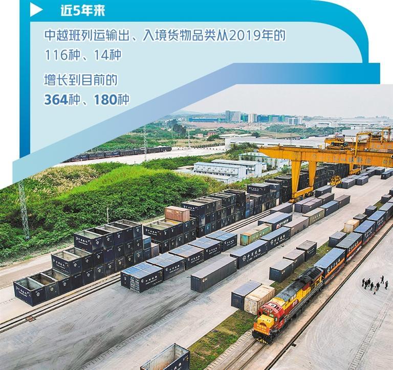 數(shù)據(jù)表明,高效、實(shí)惠、便捷的中越班列已得到市場(chǎng)認(rèn)可。近5年來,中越班列運(yùn)輸出、入境貨物品類從2019年的116種、14種,增長(zhǎng)到目前的364種、180種。中越班列集貨地已覆蓋廣西及周邊省份20多個(gè)地市,跨境貨物運(yùn)輸覆蓋越南、老撾、泰國(guó)等多個(gè)東盟國(guó)家。