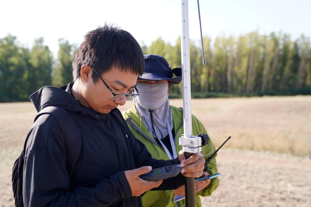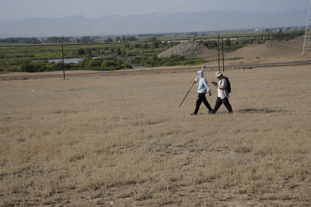 尼勒克縣第四次全國(guó)文物普查工作隊(duì)隊(duì)員魏中暢(左一)手持RTK測(cè)量?jī)x,復(fù)核文物信息。新華社記者 白志強(qiáng) 攝