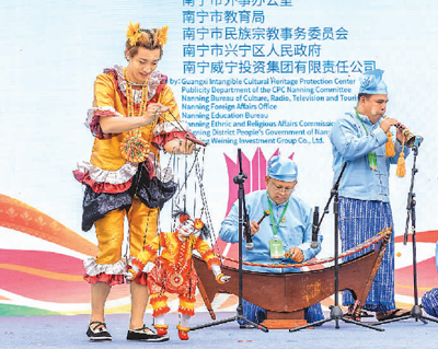四月十二日,在第二屆中國—東盟(南寧)非物質(zhì)文化遺產(chǎn)周上,演員們進行非遺展演。彭寰攝(人民圖片)