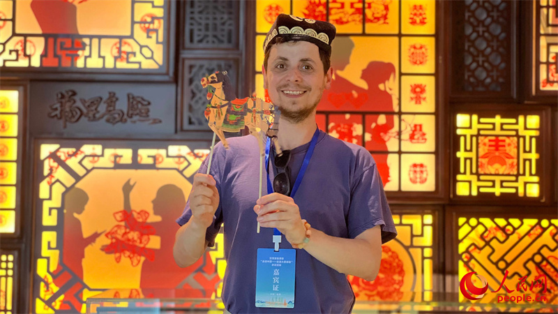 俄羅斯翻譯家、現任莫斯科物理技術學院中文系副教授羅子毅與皮影合影。人民網 李欣洋攝
