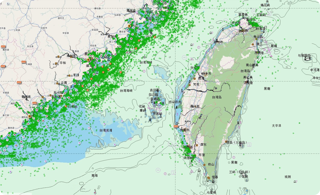 ||臺灣海峽航行船舶實時分布情況(綠點代表正在臺灣海峽航行的船只)