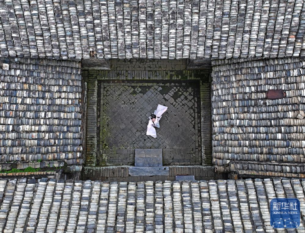 8月16日,一名身著漢服的游客在大蘆村古建筑群里跳舞(無(wú)人機(jī)照片)。
