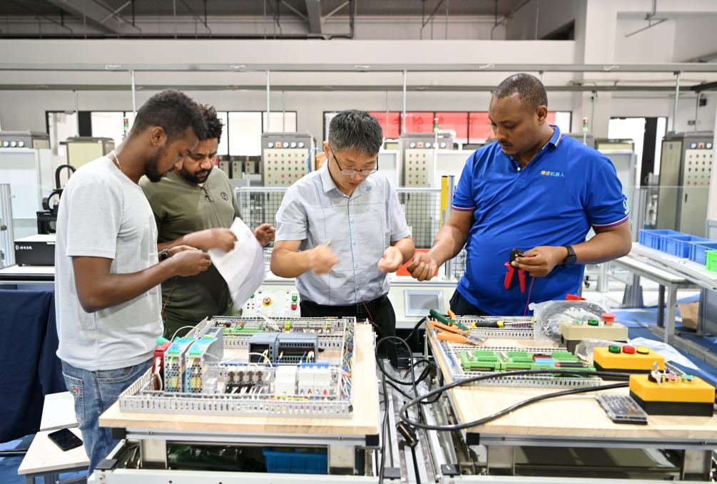 在天津職業(yè)技術師范大學,老師帶領韓士蘭(右一)和其他留學生進行實訓操作(2022年7月29日攝)。韓士蘭來自埃塞俄比亞,在天津學習期間,韓士蘭積極利用學校先進的職業(yè)教育實踐條件,專注于人工智能制造和工業(yè)機器人方向的研究。新華社記者李然 攝