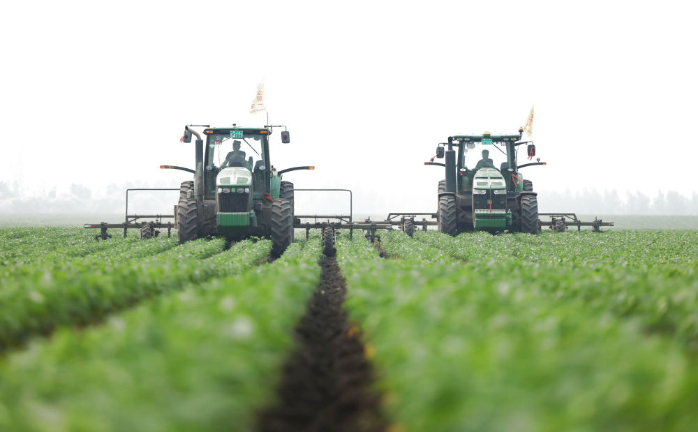 2024年6月25日,大型農(nóng)機在黑龍江北大荒集團鶴山農(nóng)場作業(yè),為土壤增溫放寒(無人機照片)。今年,黑龍江推進高標準農(nóng)田建設、侵蝕溝治理和農(nóng)田防護林更新修復一體化實施,建設高標準農(nóng)田1400萬畝、治理侵蝕溝1.2萬條,全面加強黑土地保護利用。