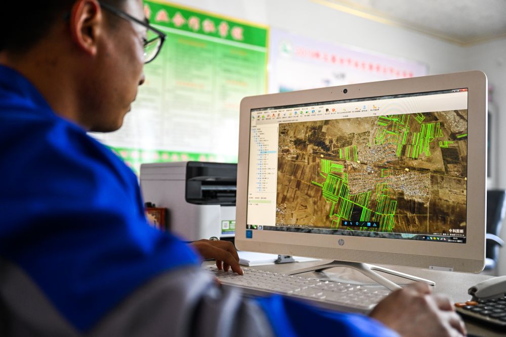 2023年4月12日,在內(nèi)蒙古通遼市科爾沁左翼中旗腰林毛都鎮(zhèn),一家農(nóng)業(yè)合作社的負責人查看耕種衛(wèi)星地圖。