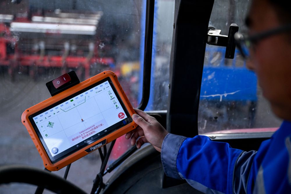 2024年3月13日,黑龍江北大荒(佳木斯)精準農(nóng)業(yè)科技有限公司工作人員測試北斗自動駕駛儀產(chǎn)品。