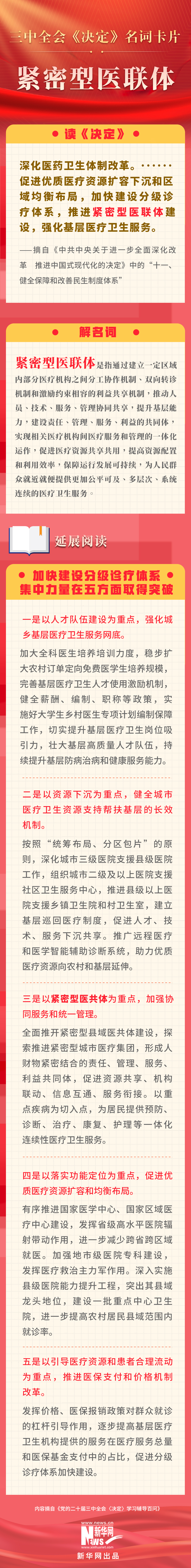 黨的二十屆三中全會審議通過了《中共中央關(guān)于進一步全面深化改革、推進中國式現(xiàn)代化的決定》。新華網(wǎng)依據(jù)《黨的二十屆三中全會〈決定〉學習輔導百問》,制作三中全會《決定》系列名詞卡片,和大家一起來深入學習領(lǐng)會二十屆三中全會精神。本期名詞是“緊密型醫(yī)聯(lián)體”。