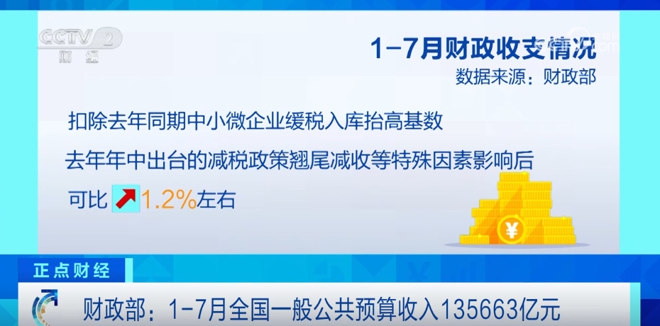數(shù)據(jù)顯示,1—7月,全國一般公共預(yù)算收入135663億元,同比下降2.6%,扣除去年同期中小微企業(yè)緩稅入庫抬高基數(shù)、去年年中出臺的減稅政策翹尾減收等特殊因素影響后,可比增長1.2%左右。