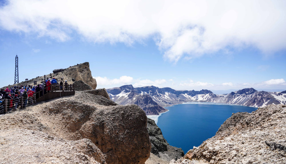 游客在長(zhǎng)白山天池景區(qū)觀賞(5月24日攝)。