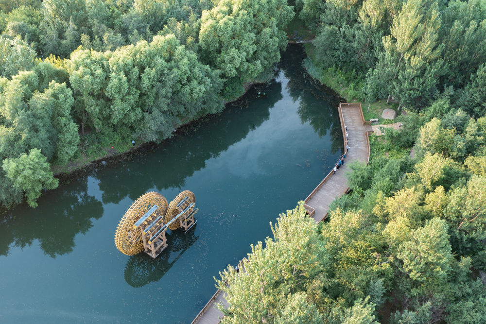 ↑這是哈爾濱太陽(yáng)島國(guó)家濕地公園局部景色(8月20日攝,無(wú)人機(jī)照片)。