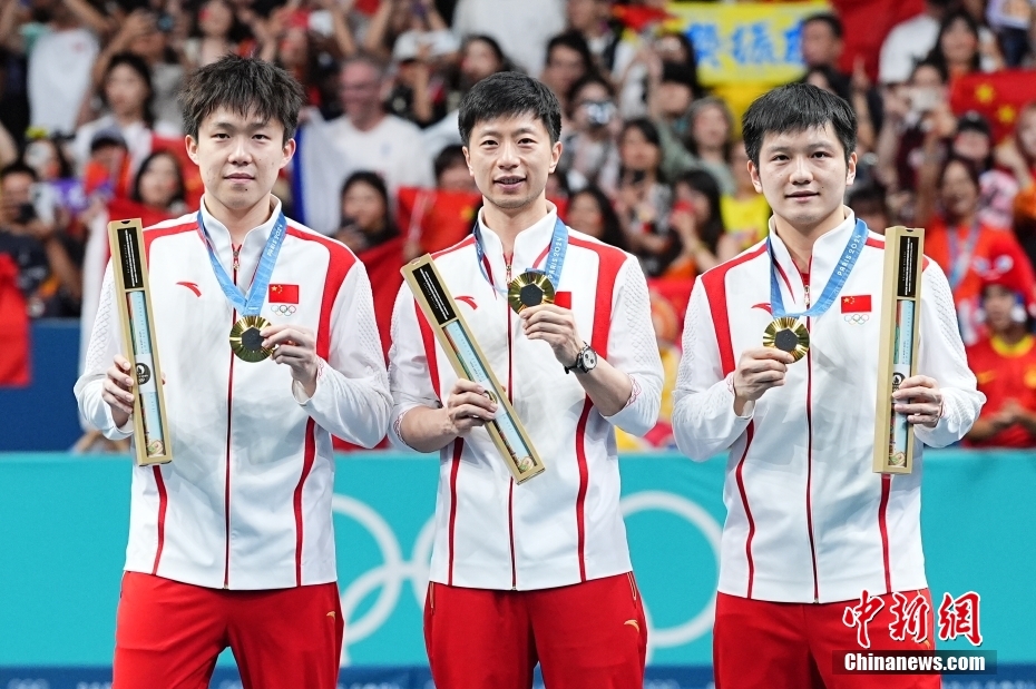在巴黎奧運(yùn)會(huì)乒乓球男團(tuán)金牌賽中,中國隊(duì)以3比0戰(zhàn)勝瑞典隊(duì),獲得冠軍。中新社記者 趙文宇 攝