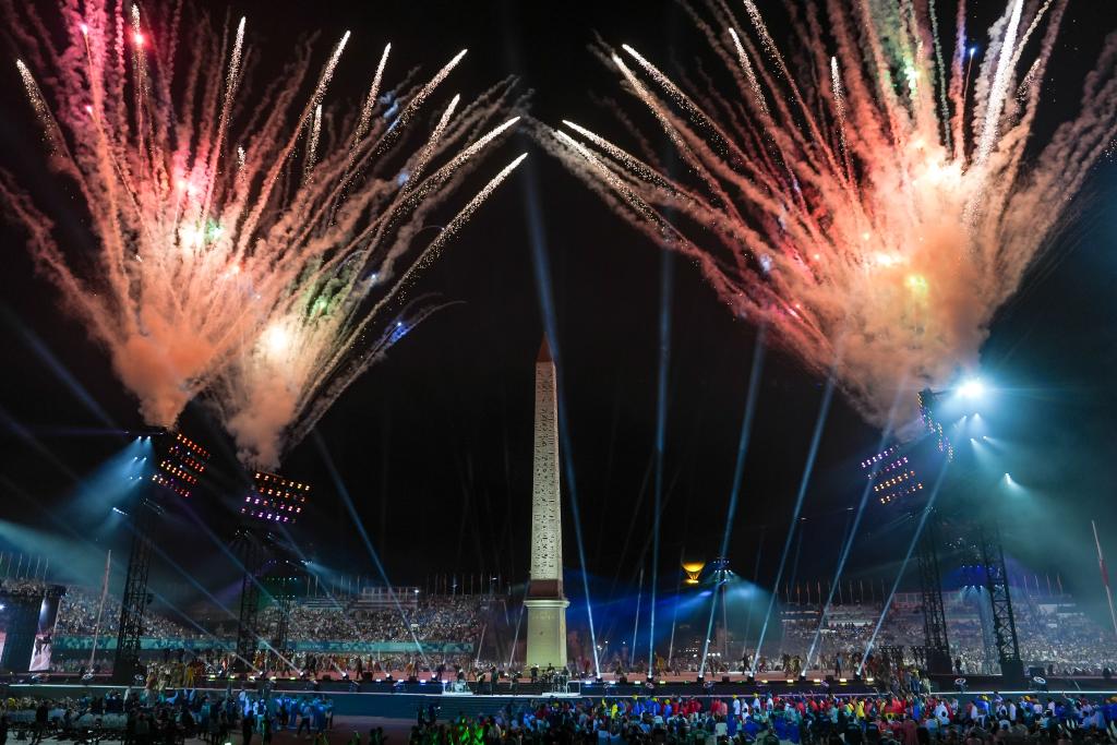 8月28日,巴黎協(xié)和廣場開幕式現(xiàn)場的焰火表演。新華社記者 張鋮 攝