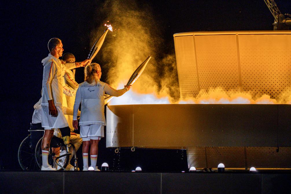 8月28日,火炬手在巴黎殘奧會(huì)開幕式上點(diǎn)燃主火炬。新華社記者 黃偉 攝