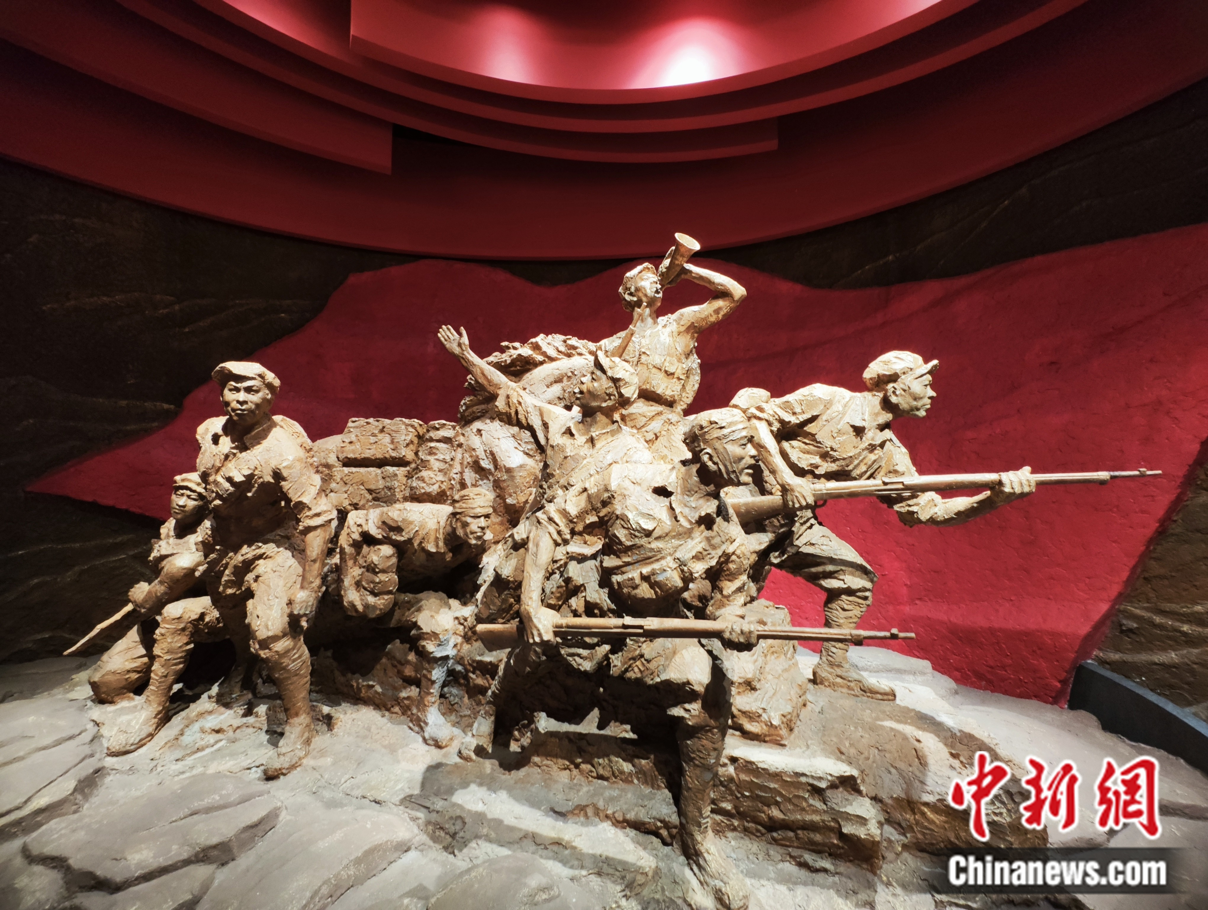展館正門外,“風展紅旗如畫”的雕塑兩側(cè),十座紅軍司號員雕像映入眼簾,它們高數(shù)米,持小號,形態(tài)各異,繪出一幅如火如荼的革命畫卷。