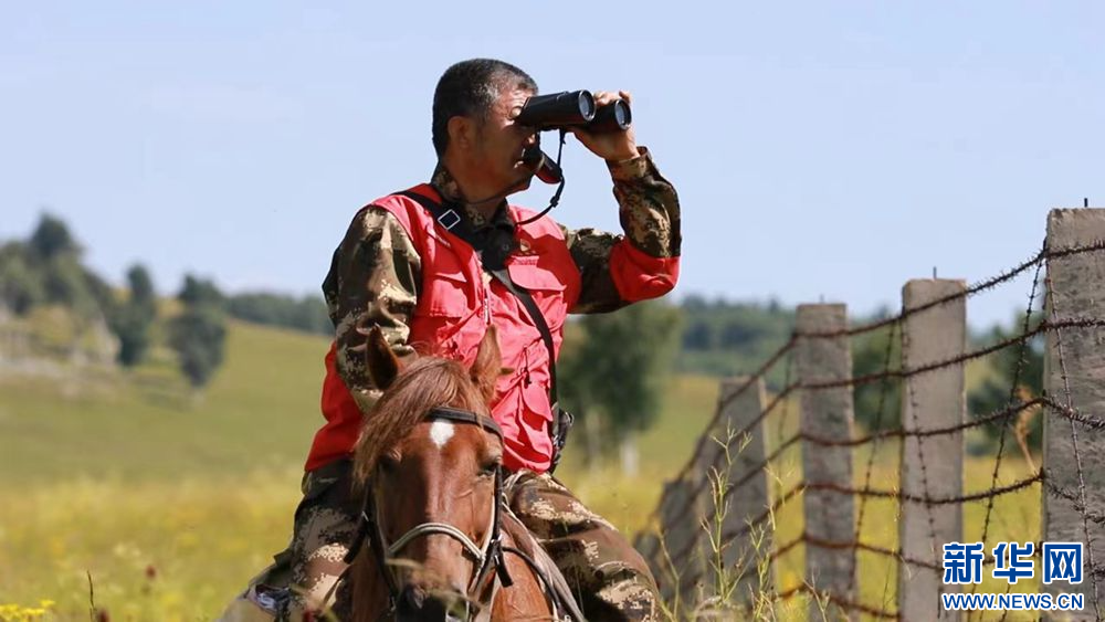 ??王玉發(fā)在騎馬巡邊時用望遠鏡觀察遠處情況。新華網發(fā)