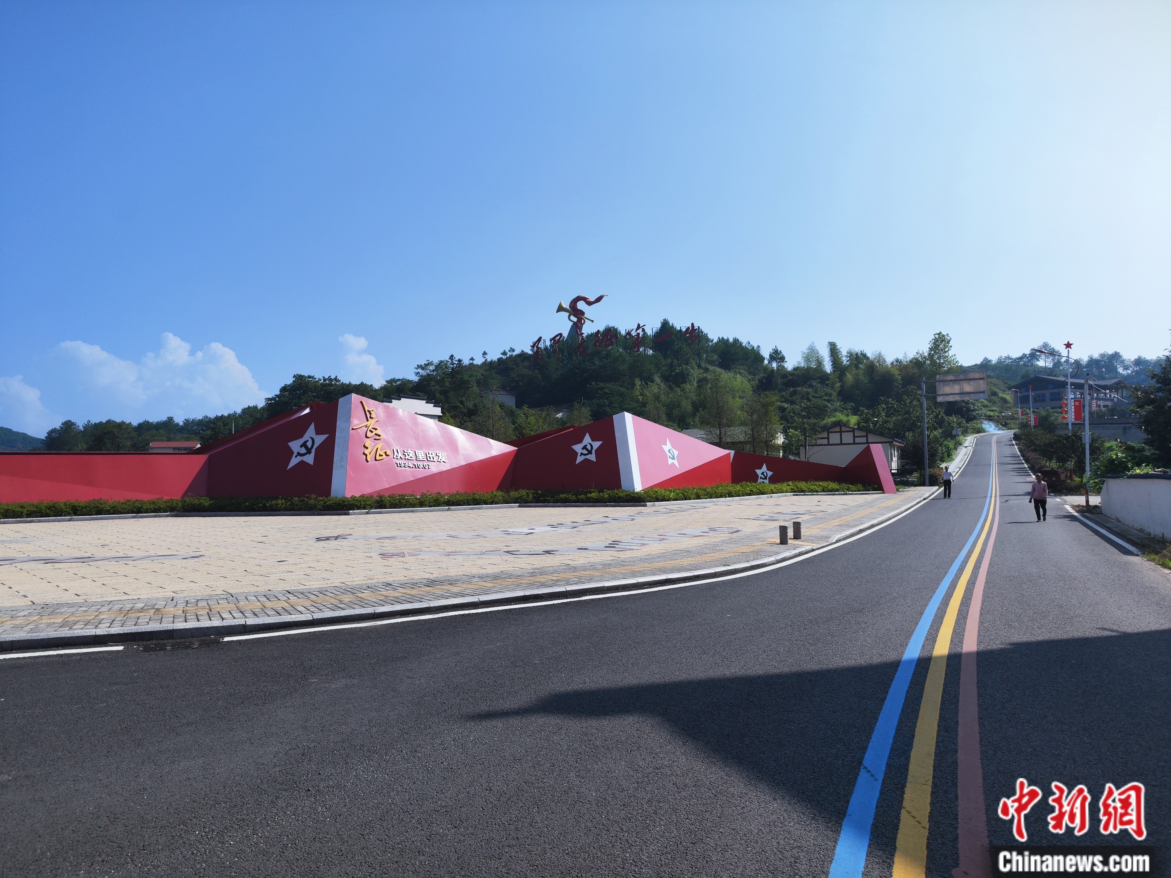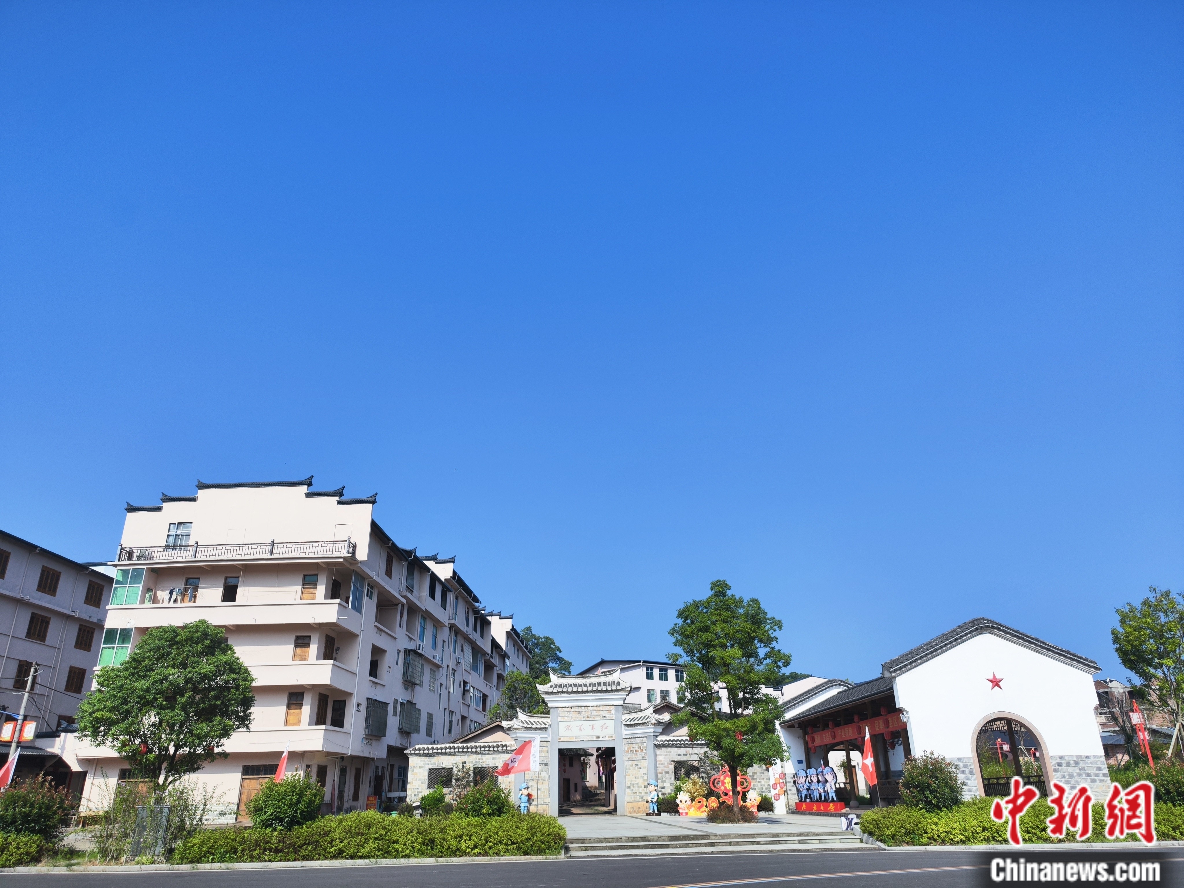 放眼望去,良田美池,碧樹繁花,阡陌交通,屋舍儼然,長(zhǎng)征主題壁畫、標(biāo)語(yǔ)隨處可見。而最引人注目的,還是那條長(zhǎng)達(dá)千米的“紅軍街”。