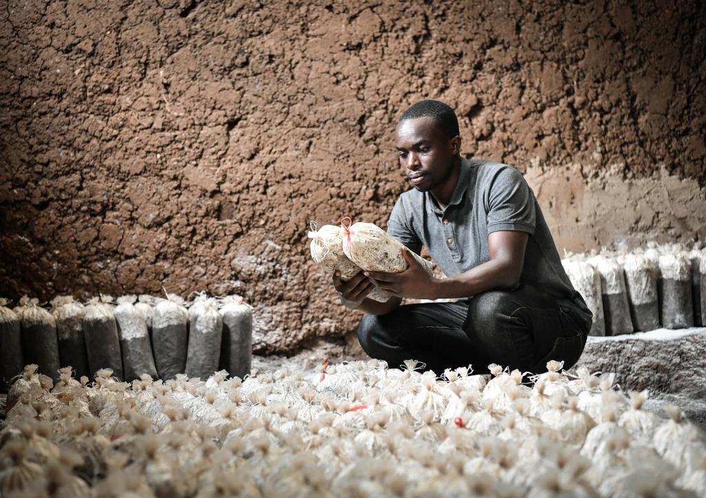 8月14日,在盧旺達(dá)南方省穆漢加區(qū),尼揚博·奧貝德在食用菌培育工坊內(nèi)檢查菌袋。曾兩次赴中國進(jìn)行菌草技術(shù)培訓(xùn)的尼揚博·奧貝德在南方省和東方省各擁有一家工坊。