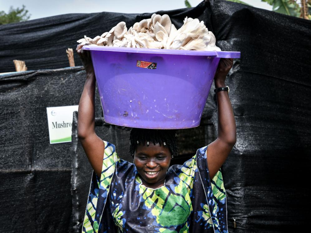 在中非共和國達(dá)馬拉市一處貧困村落里,法蒂姆·阿巴·雷基亞正在自家的菇棚內(nèi)收獲鮮菇。