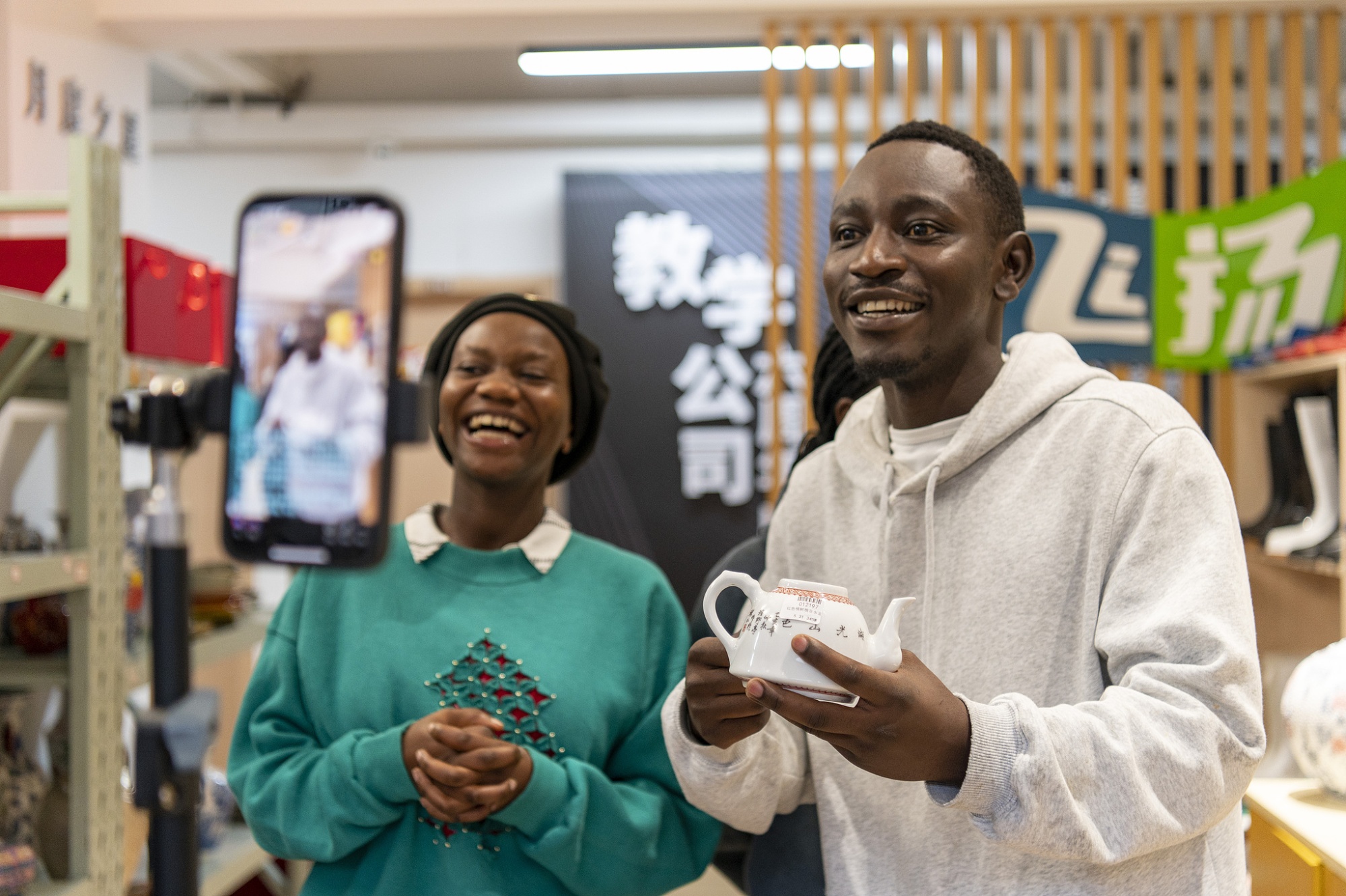 來自盧旺達(dá)的非洲留學(xué)生正在認(rèn)真練習(xí)中文“直播帶貨”