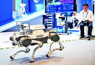 網(wǎng)絡(luò)安全博覽會上的企業(yè)展示電網(wǎng)巡線機(jī)器狗。新華社記者 鄧華攝