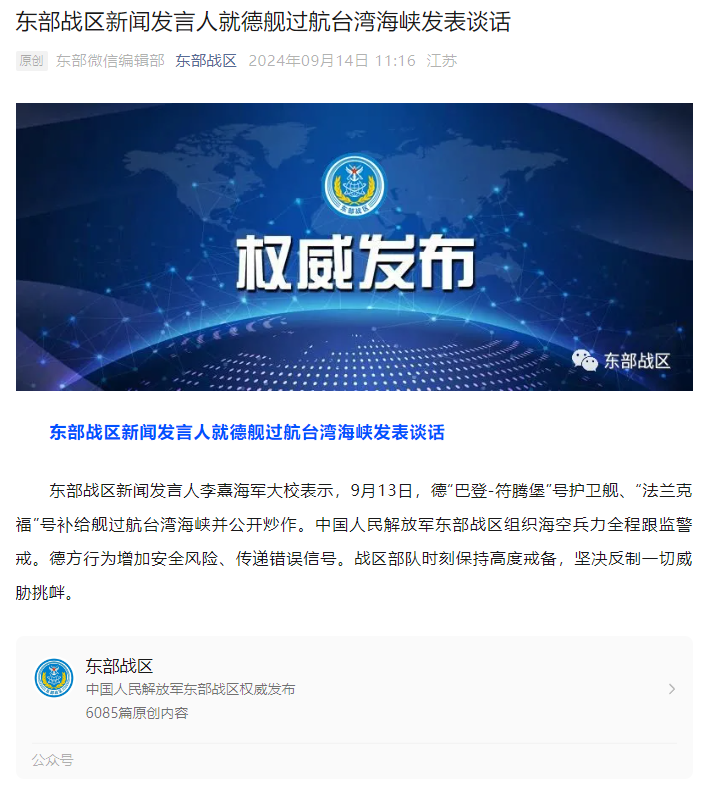 東部戰(zhàn)區(qū)新聞發(fā)言人李熹海軍大校表示,9月13日,德“巴登-符騰堡”號護(hù)衛(wèi)艦、“法蘭克?!碧栄a(bǔ)給艦過航臺灣海峽并公開炒作。中國人民解放軍東部戰(zhàn)區(qū)組織海空兵力全程跟監(jiān)警戒。德方行為增加安全風(fēng)險(xiǎn)、傳遞錯(cuò)誤信號。戰(zhàn)區(qū)部隊(duì)時(shí)刻保持高度戒備,堅(jiān)決反制一切威脅挑釁。