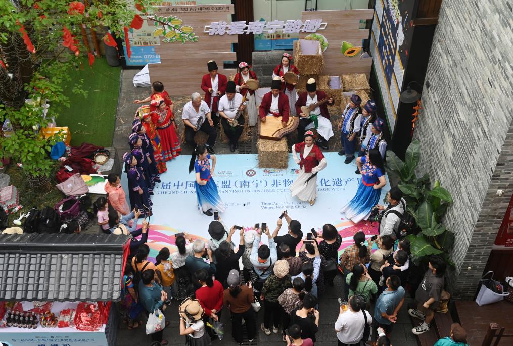 今年“三月三”期間,在南寧市三街兩巷的慶?;顒蝇F場,多彩非遺文化展演吸引游客駐足欣賞。新華社記者陸波岸 攝