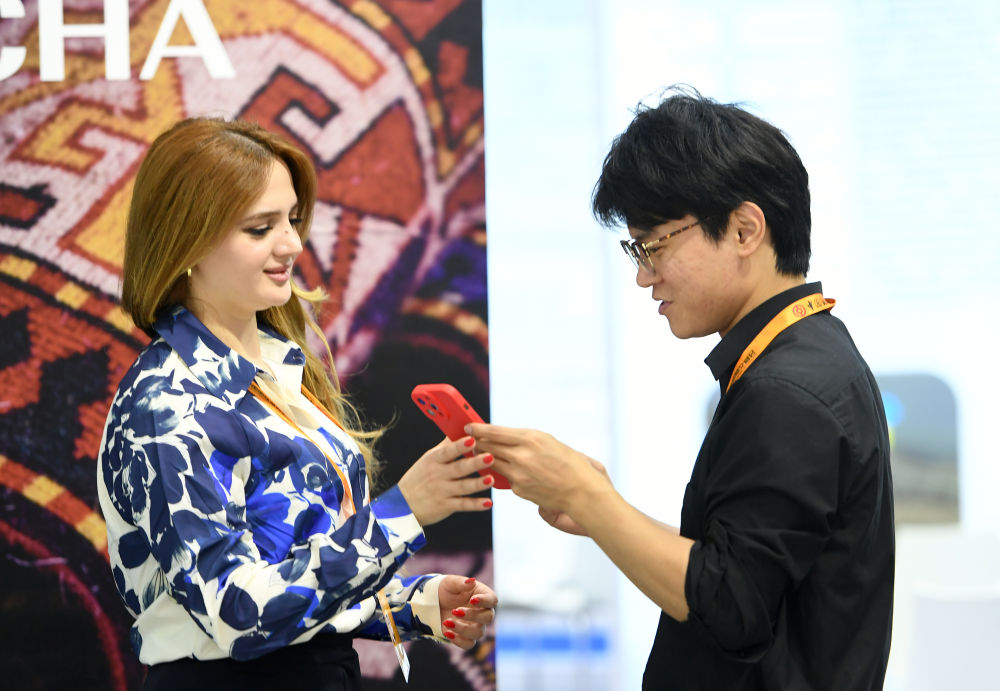 9月15日,在服貿(mào)會(huì)國(guó)家會(huì)議中心展區(qū),阿塞拜疆展臺(tái)的參展商(左)與一名中方工作人員交流。新華社記者 逯陽(yáng) 攝