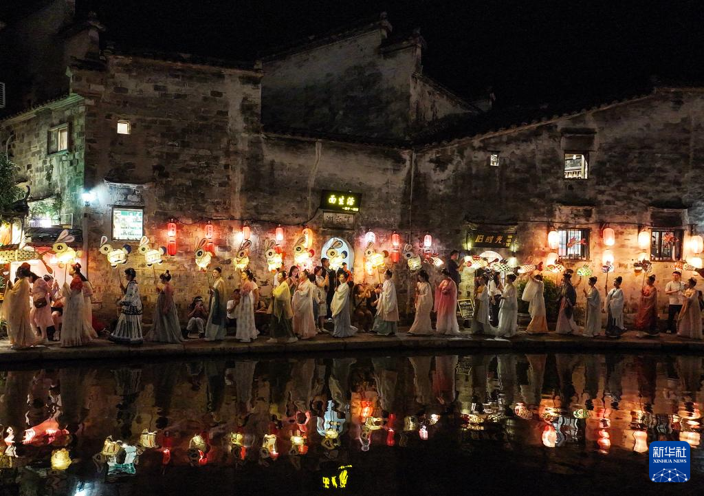 9月15日,花燈表演隊(duì)伍在安徽省黃山市黟縣宏村巡游(無(wú)人機(jī)照片)。
