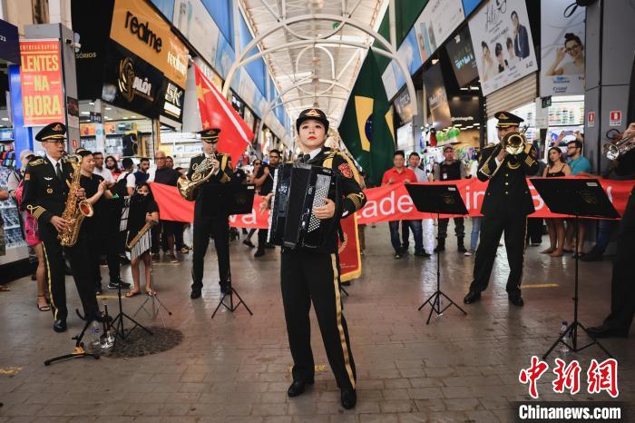 當(dāng)?shù)貢r(shí)間9月21日,巴西首都巴西利亞,參加中國(guó)軍事文化周活動(dòng)的中國(guó)人民解放軍軍樂(lè)團(tuán)演出分隊(duì),正在巴西利亞小商品市場(chǎng)演出。琚振華 攝
