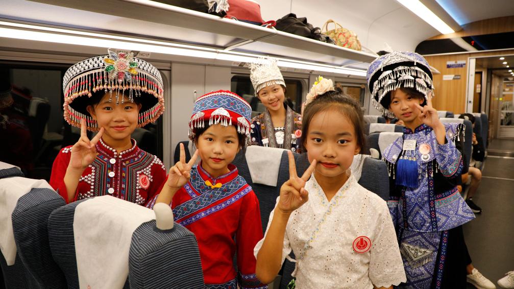 金秋九月,云南寧洱哈尼族彝族自治縣的青少年宣講團,在中老鐵路寧洱至昆明路段宣講民族團結誓詞碑故事。
