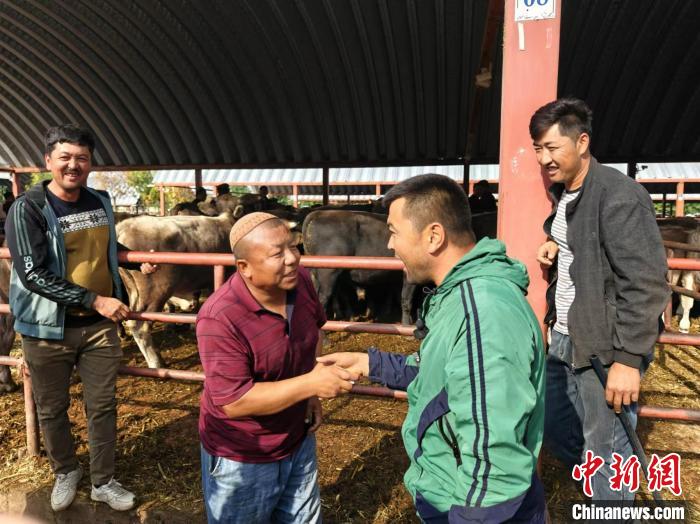 說話間,不時有其他買家、賣家以及“牛羊經紀人”過來與依力夏提·阿不都熱依木打招呼。他介紹道,黃公巴扎有維吾爾族、回族、哈薩克族、漢族等,大家相處融洽。他還邀請一個朋友向記者演示“拍手交易”——雙方用力拍手并握手,用捏手代替口頭報價。