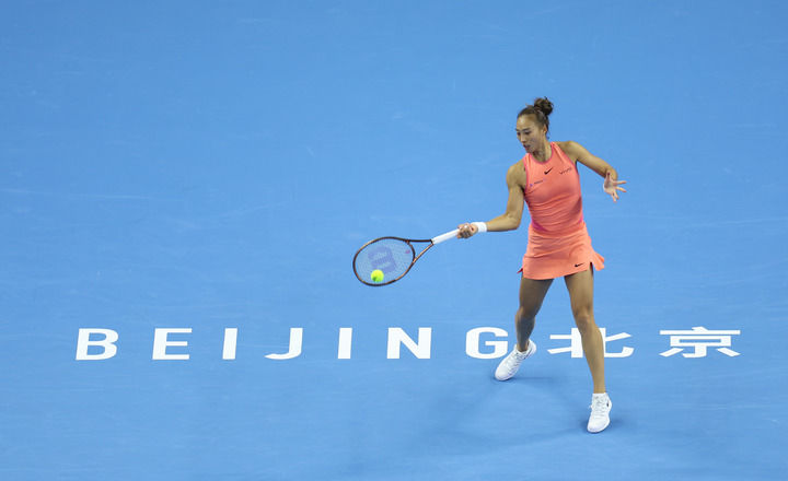 10月2日,鄭欽文在比賽中回球。當(dāng)日,在北京進行的2024中國網(wǎng)球公開賽女子單打第四輪比賽中,中國選手鄭欽文2比1戰(zhàn)勝美國選手阿尼西莫娃,晉級八強。新華社發(fā)(杜昕怡攝)