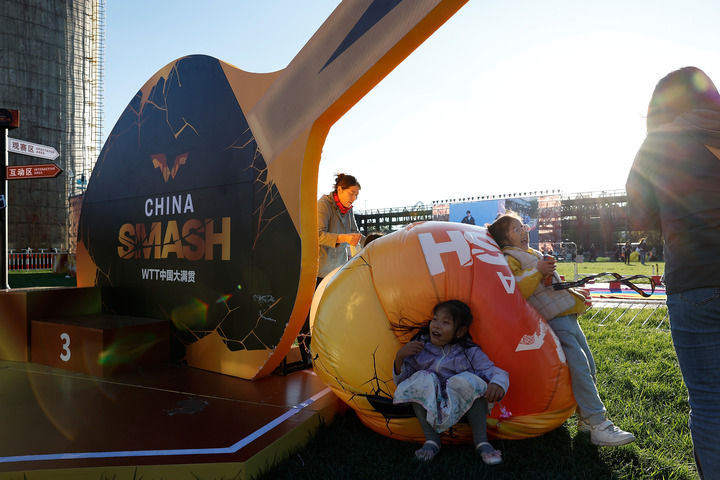 10月1日,孩子們在大滿貫公園玩耍。當(dāng)日,2024年世界乒乓球職業(yè)大聯(lián)盟(WTT)中國大滿貫比賽繼續(xù)在北京進行。新華社記者 王麗莉 攝