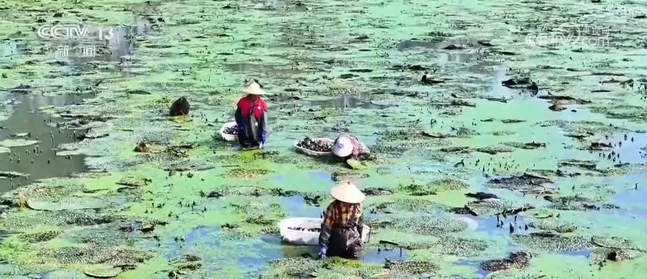 一大早,采摘工人們就來到芡實基地,穿梭在被芡實葉片鋪滿的水塘中,用手中的刀劃開芡實葉,熟練地割下一個個鮮嫩飽滿的芡實果。隨著國慶假期的消費持續(xù)升溫,這幾天當(dāng)?shù)夭烧と嗣刻斓墓ぷ髁看蠖荚?0個小時左右。