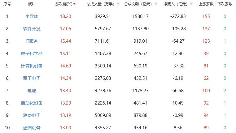 板塊方面,半導(dǎo)體、軟件開發(fā)、IT服務(wù)、電子化學(xué)品、計(jì)算機(jī)設(shè)備等漲幅居前。