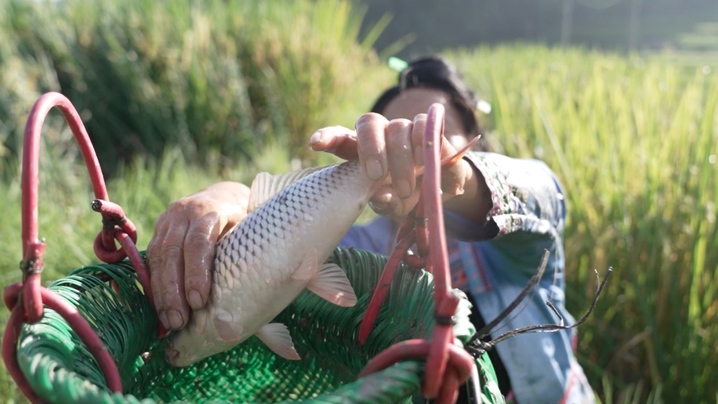 而侗族人民的智慧遠(yuǎn)不止于此,他們巧妙地利用當(dāng)?shù)刈匀画h(huán)境,孕育出獨特的“稻魚鴨”共生稻作文化。從江縣往洞鎮(zhèn)增沖種植養(yǎng)殖專業(yè)合作社負(fù)責(zé)人石剛勇說,“種植一季稻、放養(yǎng)一批魚、飼養(yǎng)一批鴨,稻魚鴨系統(tǒng)能夠和諧共存,是因為打了時間差。種稻的時候放魚苗,魚苗能清理土壤,讓土壤疏松。等到農(nóng)歷的三月下旬或四月上旬,再放入鴨苗。此時的秧苗已經(jīng)長成,剛出生不久的鴨苗不會損壞秧苗,鴨子吃田里的蟲子,它們的糞便喂魚,魚糞又滋養(yǎng)稻谷,這就形成了一個完美的生態(tài)循環(huán)?!?/p>