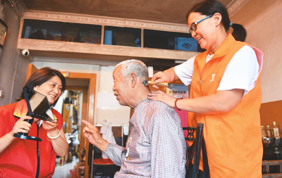 河南省洛陽市澗西區(qū)積極構(gòu)建“嵌入式”養(yǎng)老服務(wù)體系,為老年人提供養(yǎng)老助餐、社區(qū)娛樂、健康管理、上門保潔等綜合養(yǎng)老服務(wù)項目,讓老人在家門口享受全方位養(yǎng)老。圖為澗西區(qū)武漢路街道秦嶺路社區(qū),養(yǎng)老服務(wù)中心護理員和社區(qū)志愿者為居家老人理發(fā)。黃政偉攝(人民視覺)
