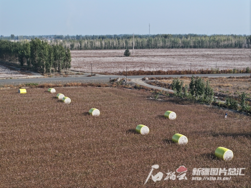 10月10日,沙灣市大泉鄉(xiāng)燒坊莊子村的萬(wàn)畝棉田,一個(gè)個(gè)打包好的“金蛋蛋”散落在田間。孫志坤 攝