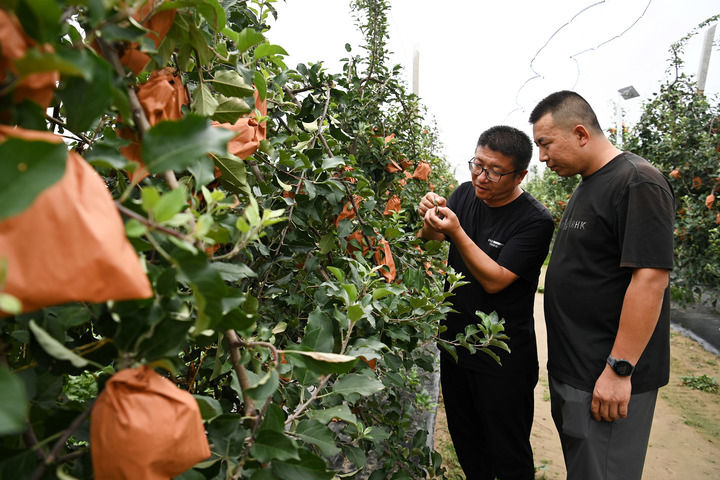 延安市安塞區(qū)果業(yè)技術(shù)推廣中心主任張剛(左)在果園觀察果樹長勢(shì)(2024年8月8日攝)。新華社記者 鄒競一 攝