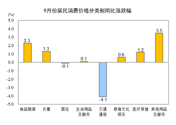9月份,全國居民消費(fèi)價格環(huán)比持平。其中,城市下降0.1%,農(nóng)村上漲0.1%;食品價格上漲0.8%,非食品價格下降0.2%;消費(fèi)品價格上漲0.2%,服務(wù)價格下降0.3%。