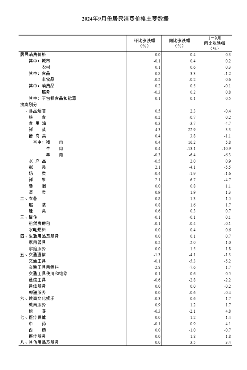 2024年9月份,全國居民消費(fèi)價格同比上漲0.4%。其中,城市上漲0.4%,農(nóng)村上漲0.6%;食品價格上漲3.3%,非食品價格下降0.2%;消費(fèi)品價格上漲0.5%,服務(wù)價格上漲0.2%。1—9月平均,全國居民消費(fèi)價格比上年同期上漲0.3%。