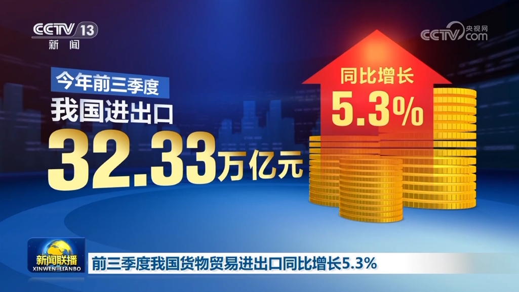 據(jù)海關(guān)統(tǒng)計,今年前三季度,我國進(jìn)出口32.33萬億元,同比增長5.3%。其中出口18.62萬億元,增長6.2%;進(jìn)口13.71萬億元,增長4.1%。