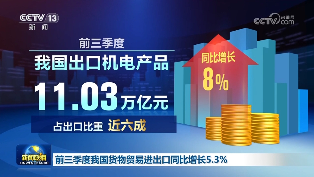從國內(nèi)看,出口產(chǎn)品結(jié)構(gòu)持續(xù)優(yōu)化。前三季度,我國出口機電產(chǎn)品11.03萬億元,同比增長8%,占出口比重近六成。