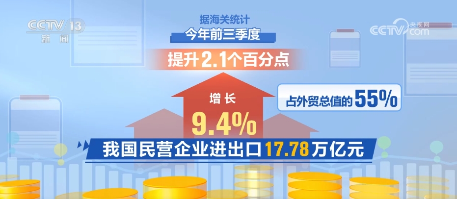 據(jù)海關(guān)統(tǒng)計,今年前三季度,我國民營企業(yè)進出口17.78萬億元,增長9.4%,占外貿(mào)總值的55%,提升2.1個百分點;外商投資企業(yè)進出口9.53萬億元,增長1.1%,連續(xù)兩個季度增長;國有企業(yè)進出口4.95萬億元,增長0.1%。
