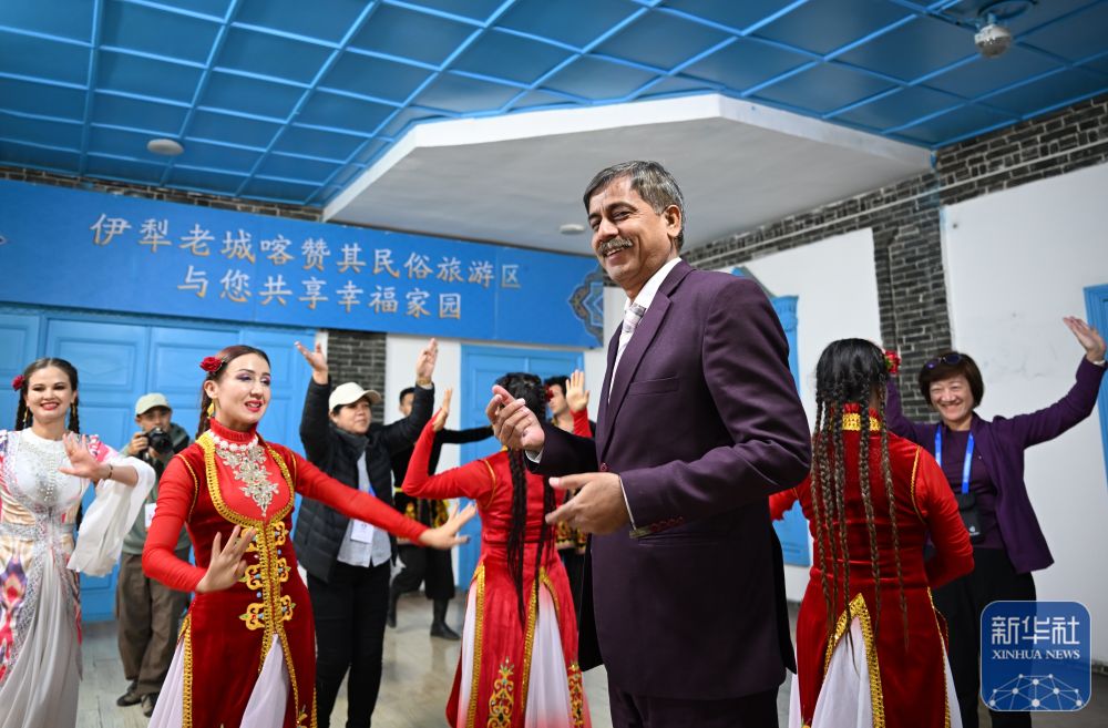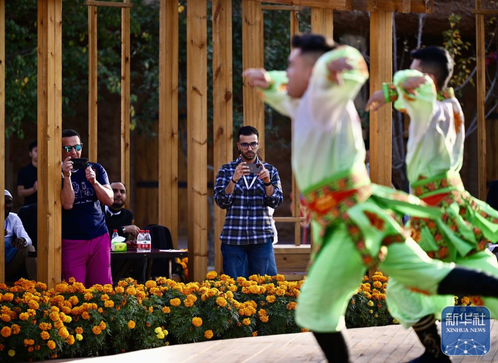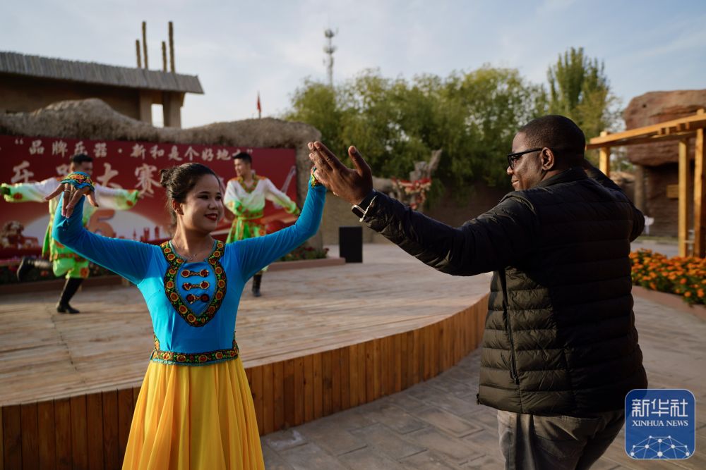10月15日,與會嘉賓在伊寧市喀贊其民俗旅游區(qū)與表演者互動。