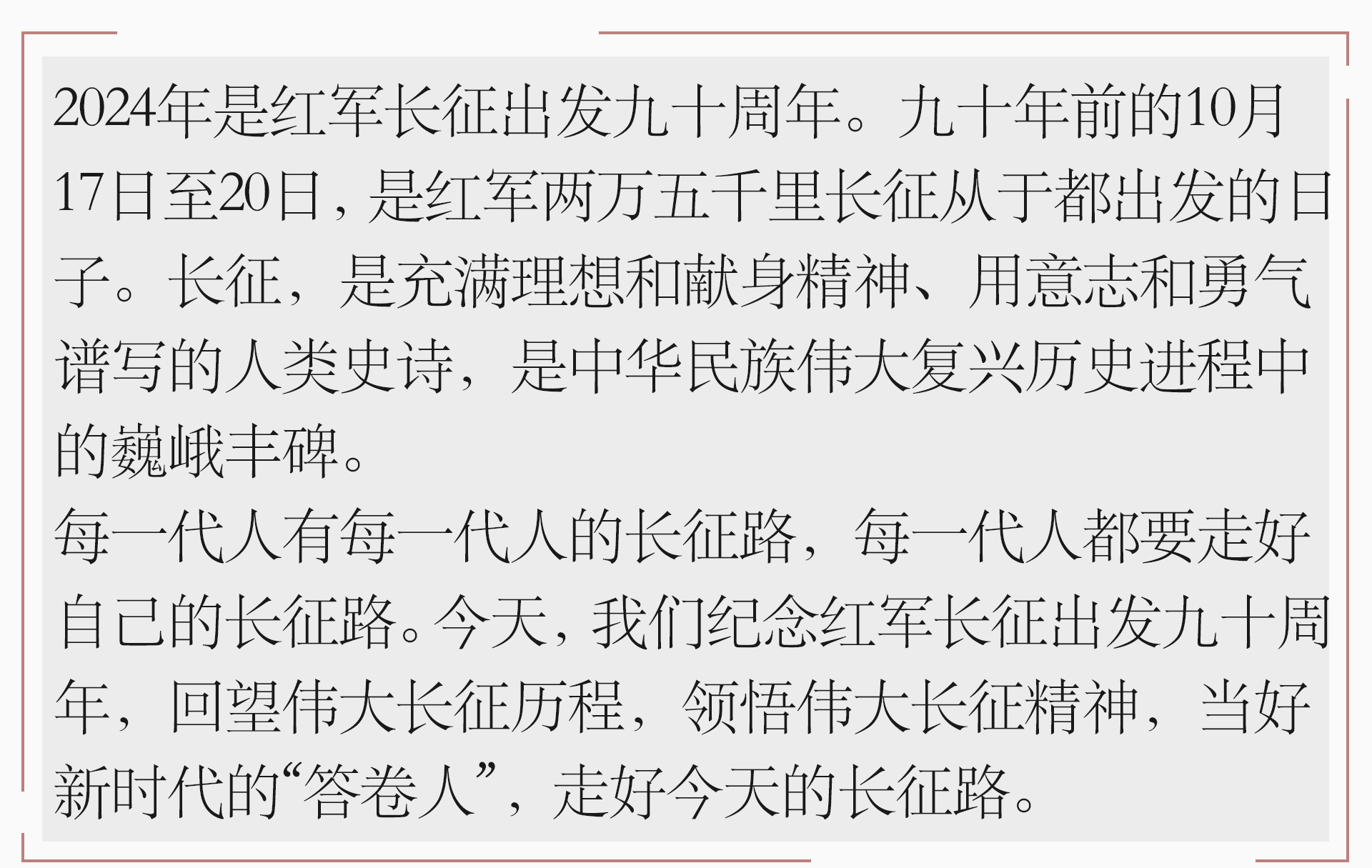 長征是一次理想信念的偉大遠(yuǎn)征。中國共產(chǎn)黨領(lǐng)導(dǎo)紅軍,以非凡的智慧和大無畏的英雄氣概,戰(zhàn)勝千難萬險(xiǎn),付出巨大犧牲,勝利完成震撼世界、彪炳史冊的長征,實(shí)現(xiàn)了中國共產(chǎn)黨和中國革命事業(yè)從挫折走向勝利的偉大轉(zhuǎn)折,開啟了中國共產(chǎn)黨為實(shí)現(xiàn)民族獨(dú)立、人民解放而斗爭的新的偉大進(jìn)軍。