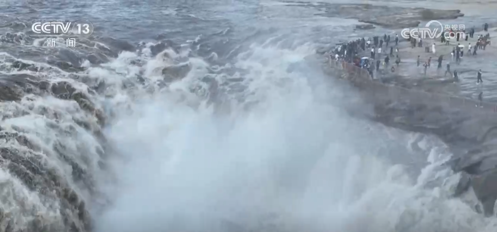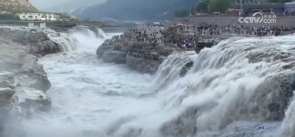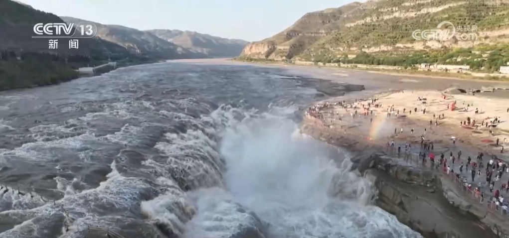連日來,受上游水庫(kù)調(diào)節(jié)放水影響,位于山西吉縣和陜西宜川縣交界的黃河壺口瀑布水量豐沛。從空中俯瞰,黃河流經(jīng)晉陜峽谷到達(dá)壺口,水面由三四百米寬驟然收縮為50多米,再墜入“十里龍槽”,濺起數(shù)十米高的水霧,氣勢(shì)磅礴。據(jù)了解,黃河壺口段目前正處于秋汛期,最大水流量約為1300立方米/秒,是日常水流量的3倍,主瀑與副瀑連成一片,呈現(xiàn)出一條線狀,場(chǎng)面壯觀。進(jìn)入10月份以來,黃河壺口瀑布景區(qū)日均接待游客超過2萬人次。