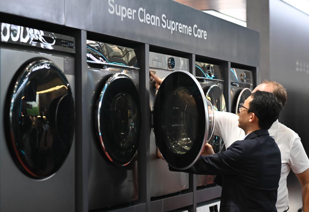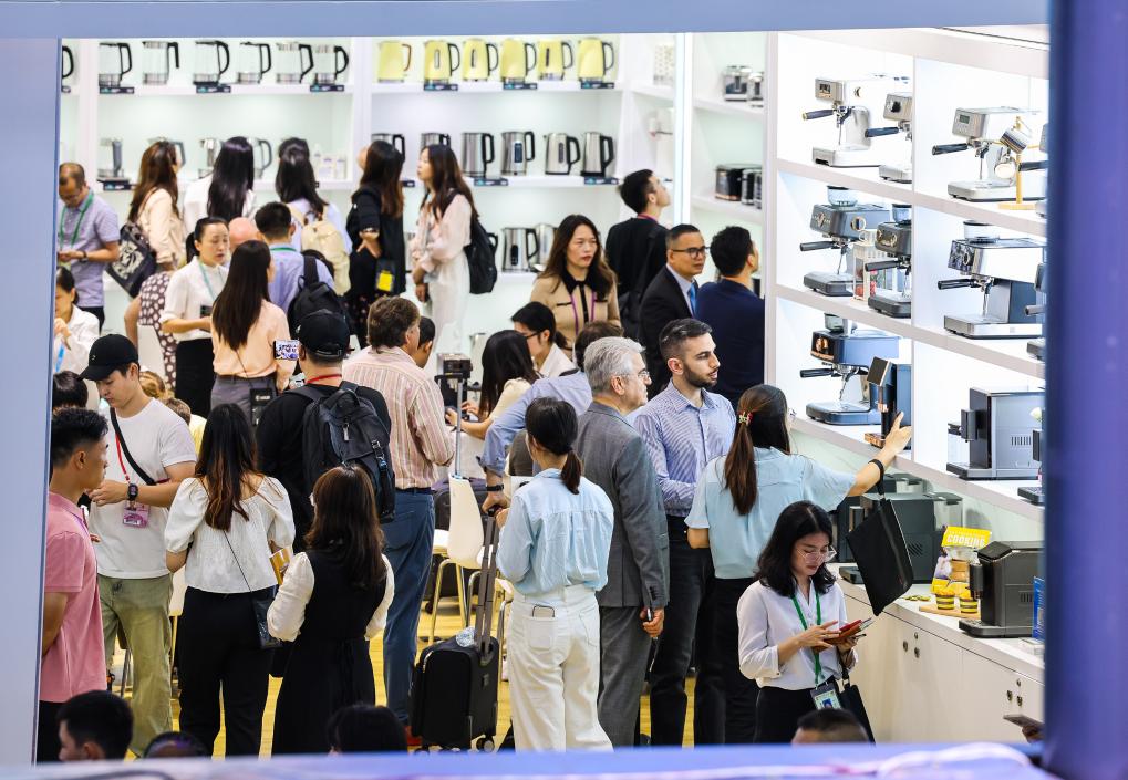10月15日,境外采購商觀看參展企業(yè)家電產品。新華社記者鄧華 攝