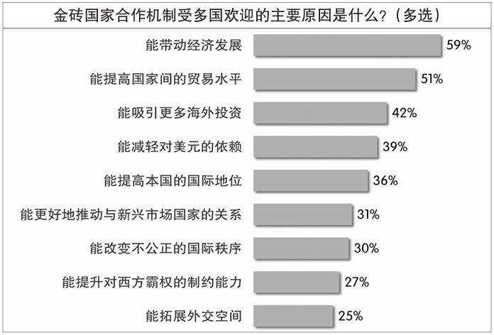 在12國受訪者看來,金磚機制受多國歡迎的最主要原因是它“能帶動經(jīng)濟發(fā)展”,有近六成受訪者認同此原因。過半受訪者認為,“能提高國家間的貿(mào)易水平”是金磚機制受歡迎的原因。此外,能“吸引更多海外投資”“減輕對美元的依賴”“提高本國國際地位”等原因也獲得較多認同。王友明對《環(huán)球時報》記者分析說:“開放、包容、合作、共贏的精神是金磚國家能夠走向‘大金磚’的根本原因,這四個要素缺一不可。”